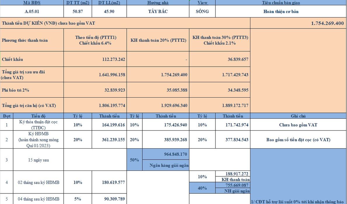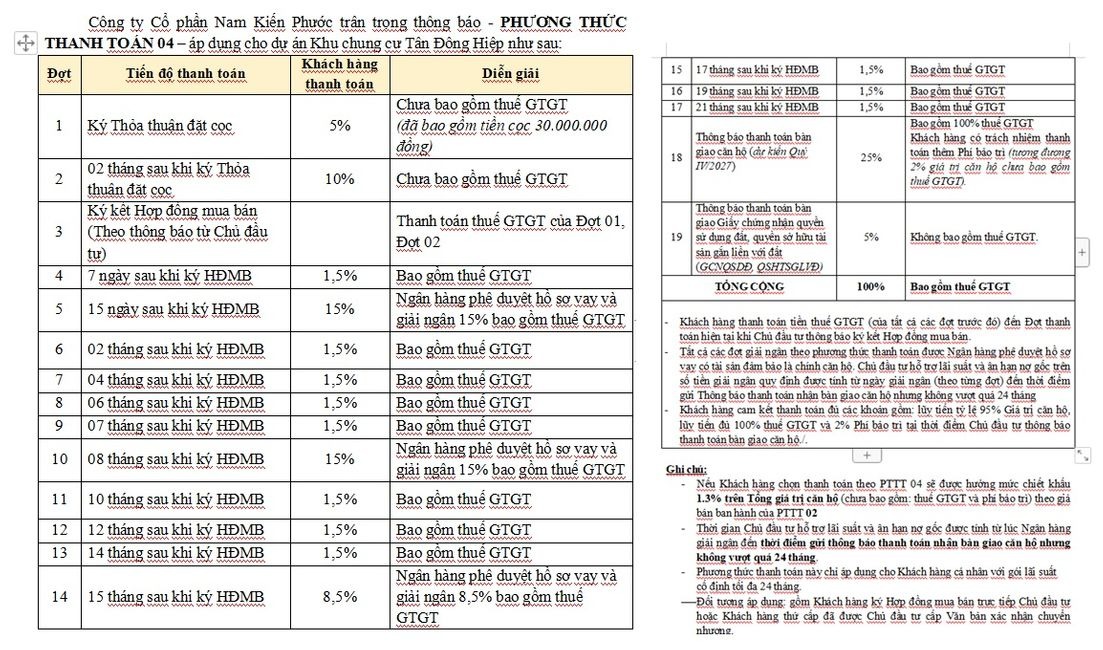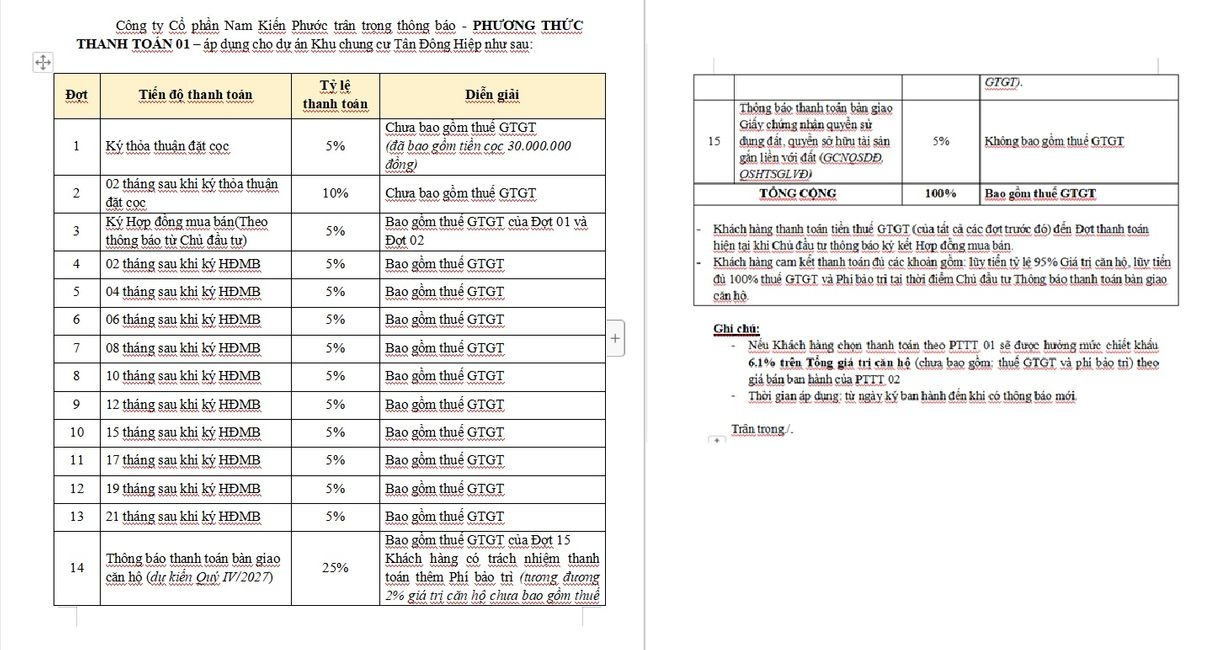 Khách hàng cần thanh toán theo tiến độ tháng bằng tiền mặt để nhận chiết khấu