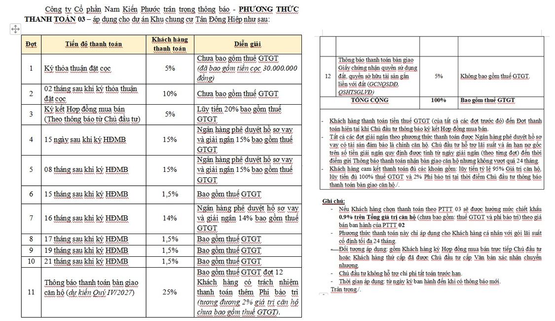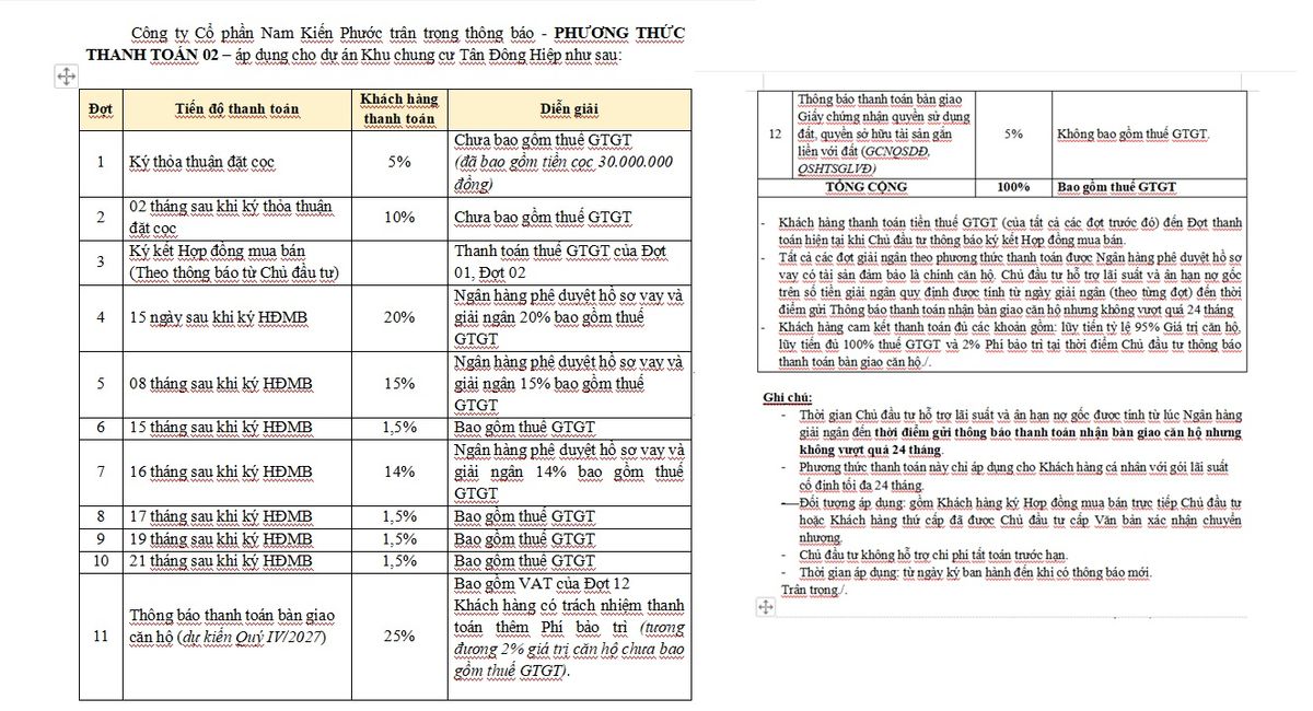 26% vốn tự có khách hàng sẽ đóng vào 7 đợt trong 24 tháng. Cùng lúc sẽ làm hồ sơ vay ngân hàng. Nhưng đến khi nhận nhà mới bắt đầu trả góp, còn lại ngân hàng hỗ trợ vay 70%
